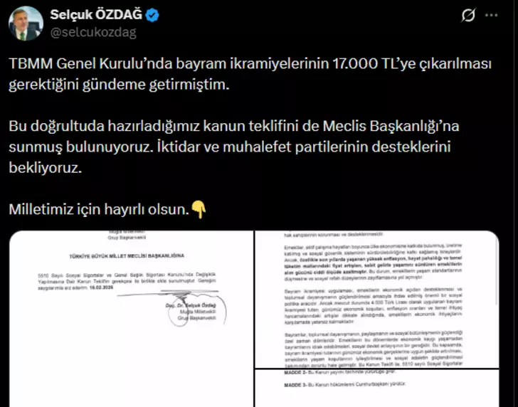 Kaynak: Selçuk Özdağ (Yeni Yol Grup Başkanvekili): “TBMM Genel Kurulu’nda bayram ikramiyelerinin 17.000 TL’ye çıkarılması gerektiğini gündeme getirmiştim. Bu doğrultuda hazırladığımız kanun teklifini de Meclis Başkanlığı’na sunmuş bulunuyoruz. İktidar ve muhalefet partilerinin desteklerini bekliyoruz.”