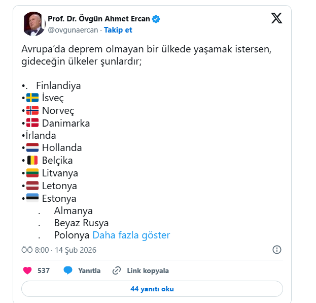 Prof. Dr. Övgün Ahmet Ercan, sosyal medya hesabından yaptığı son değerlendirmede, Avrupa kıtasında fay hatlarından tamamen uzak ve jeolojik olarak “durgun” kabul edilen ülkeleri sıraladı. Listede özellikle İskandinavya ve Baltık ülkeleri dikkat çekiyor. Ercan’a göre, deprem korkusu olmadan yaşanabilecek ülkelerin başında Finlandiya, Norveç, İsveç ve Danimarka geliyor.